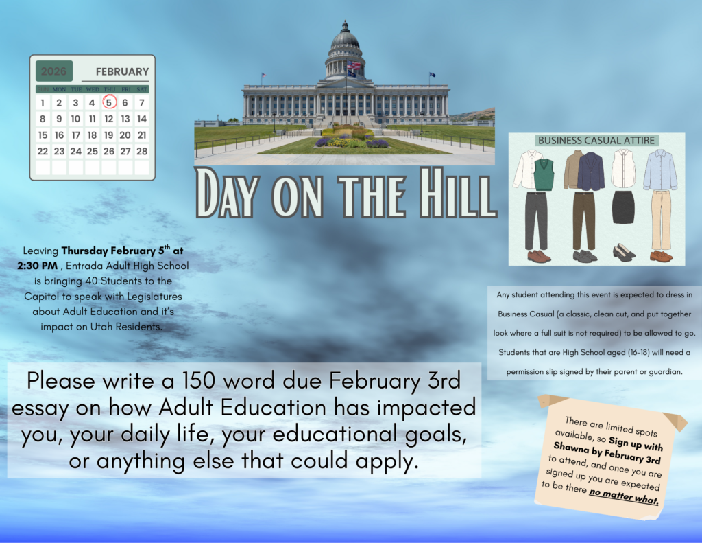 Leaving Thursday February 5th at 2:30 PM , Entrada Adult High School is bringing 40 Students to the Capitol to speak with Legislatures about Adult Education and it’s impact on Utah Residents.